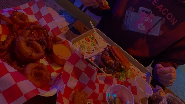 Amazing spicy chicken sando amazing with thick cut onion rings in a spiced batter so greasy messy good! Flavors are bomb for spice lovers! I recommend trying them for sure!