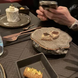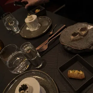 Hudson Valley Foie Gras Tart, Kaluga Caviar Macaron, Waygu Beef Tartare Canneloni.