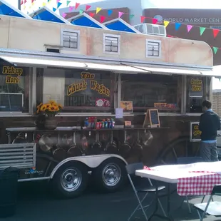 Friendly staff. I also love the advertising wrap on the truck itself- it really does remind you of a chuck wagon, with images of hanging cast iron pots and other cookware. As for the food, I just can't say it's worth the price. I had the wings and fries combo for $8.00. The wings tasted exactly the way I'd make them, which is to say, buy some premade buffalo sauce and douse the cooked wings in it. The fries looked like crinkle cut frozen fare that was deep fried on the spot. I'm not saying the food is bad; if you're hungry for lunch it'll do. I like the people running the Chuck Wagon so I hate to give anything less than 5 or 4 stars but I'm being honest. If I can make the same quality meal at home with little effort and much less money, why pay $8 for it?