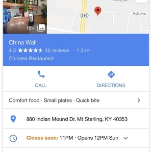 Google says the close at 11 (I know I was cutting it close) but I called at 10:34 to see if I could still make an order because they were closing soon. They tell me they closed at 10:30. They shouldn't have answered their phone if they weren't going to be open. All I wanted was shrimp w broccoli. :( this still one of my favorite Chinese places though..