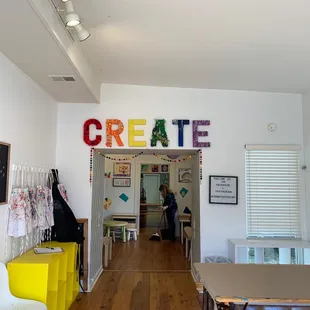 My son and I attended a birthday party at Create Studio this past weekend and had a great time! There is plenty of meter parking around the area, and since it was the weekend it was free! The entrance to Create is a toy store and it looked like they had a lot of fun items- I will definitely be back when looking for kids gifts. We were welcomed by the owners through the lego rainbow to join the party. My son was immediately so excited about all the fun activities that were set up! There were 3 sensory/play bins, a play dough station, and an art station arranged with tons of supplies for the party-goers to paint a doughnut. My son is a year and a half so he was mainly into the sensory bins. There was also a giant "cake" set up with colored shaving cream "paint" so the attendees could decorate the cake. I was a little worried that my son was making such a mess being pretty young, but the owners were really chill about it and encouraged him to participate! We had a great experience and I would love to go back to Create!
