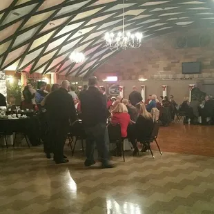I attended a wedding reception here last month. This place has a lodge feel. It feels old and masculine to me. There is one HUGE room with a very tall ceiling. There's a second floor entrance with a balcony that provides a nice entrance for the wedding party and newlyweds. One end of the hall provided the buffet and the other end had a small bar with non alcoholic beverages. If you leave this main hall and go towards where you entered we found the bar with alcohol and also the restrooms. This place definitely had a more casual feel than other venues I've been to. I'm not positive that the caterer was in house, but I think it might've been. It definitely tasted better than it looked! But it did look like middle school cafeteria food. So if having top notch food is a priority, keep that in mind for your event.