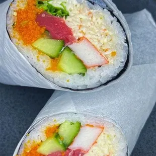 Build your own sushi bowl. It is delicious! Firecracker chicken, noodles, and more! Beware, the noodles are cold but really good.