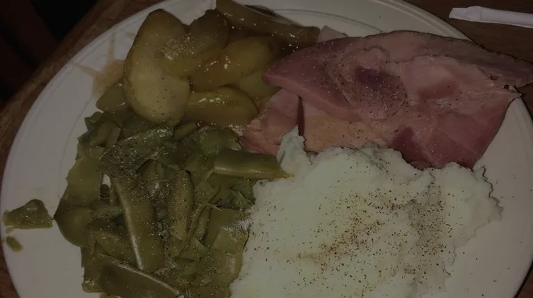 ham, green beans, and a roll