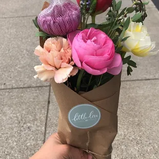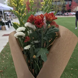Yelp hosted a zoom flower arranging lesson Saturday and I bought the suggested flower kits and vases from Little Lou Flower Truck and I invited 2 other ladies to join me in participating. The flowers and greenery were gorgeous, large leafed eucalyptus, wax flowers, carnations and several stunners I don't remember the names for. We loved the class and our bouquets! I will be keeping an eye out for the cute little truck. Audrey was very friendly and helpful. The flowers were fairly priced for their uniqueness and quality.
