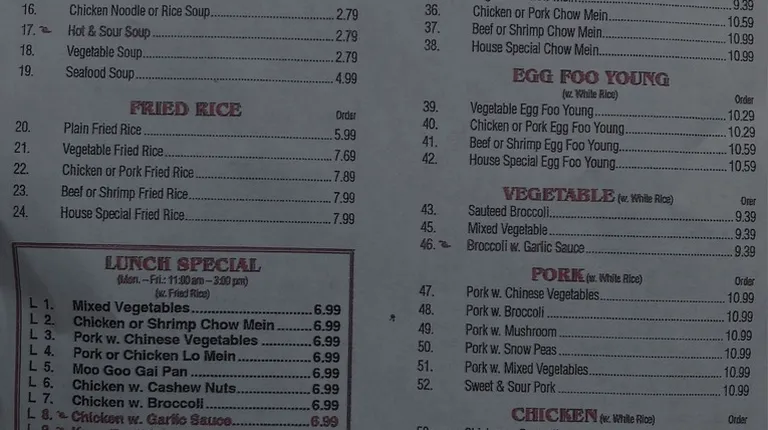 Very good food, and portions are huge!! The prices are average. They're generally pretty quick to serve up as well! Not many places I'm Falmouth to eat, but this is good if you want Chinese.