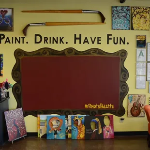 We finally used our giftcards to come here and paint - then won two more! So we will definitely be back! If you check-in on Yelp or Facebook you get to spin a wheel to win prizes :)Last week we painted "Joy" on canvas and they showed us how to add lights to make it unique. We went on a Wednesday, so wine was $5 a glass. The instructor did a good job and played fun, upbeat music. Another member of the staff walked around to help people while painting. They had a blow dryer to speed up the drying process. It's not really my thing because I'm impatient - but I don't mind going once in a blue moon with friends or as a date.