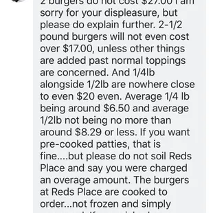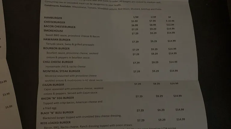 We were at Red's last night.Our food was Great !! Our server was very good considering she was The Only One and was taking care of about 7 tables of 2 or more customers. She really could have used at least one more server to help. She was Waitress, Bus and Cashier plus took phone orders and fixed To-Go orders. It took a little longer to get our dinner than I'd have liked but when we did, it was Delicious !! If you're in a hurry, don't go.... if you have some time, definitely worth it. Nice, polite hard worker and great food .... just not sure I would go back unless Red gets some help3 Stars due to server's lack of help Food 5