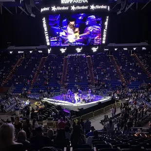 I'm at Rupp arena to see Blake Shelton. Tickets were on the high bench seats with no back. But the sound is good and good view from high up.