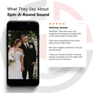 5 stars hands down. Affordable. Amazing to work with. They bring the party with them. Our wedding was 10/10/2020. They were a one stop shop for us and covered a lot of our wedding needs. Our music was on point to exactly what we wanted. We had a NFL football theme wedding and the spin around sound crew wore referee shirts! Our entry announcement to bridal party and Mr. And Mrs. Was the bomb.com! You felt like you were on the football field being announced as you ran through the banner! It was epic. They personalize everything to you. My family and friends thought we knew the crew from spin around sound before we booked them. That is how personalized they get. You come first. They will always be number one on my list when I have event needs for the future!