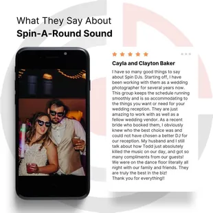 We booked Spin-A-Round Sound for our wedding this year and we are so glad we did! From the get-go Todd was so helpful and professional as we planned our wedding. We booked Spin-A-Round as the DJ, emcee, and photo booth. Todd was our emcee and he did a phenomenal job of keeping the evening on schedule and making sure the dance floor stayed packed. Todd accommodated for last minute changes and did a great job reading the room and taking requests from our guests!