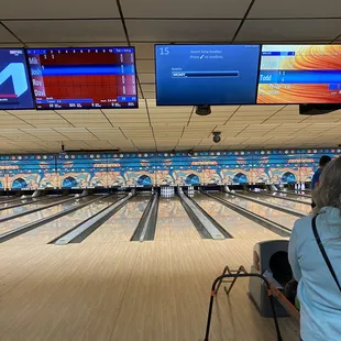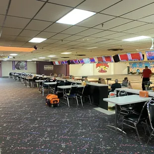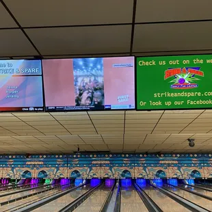 COVID-19 restrictions enforced Good location Plenty of parking Restrooms needed cleaning, small limited Restaurant with seating Bowling specials available Over 20 lanesElectronic score boards After 10 pm cosmic bowl