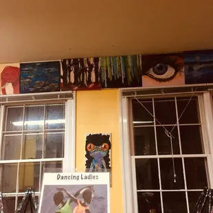 Instructional cards with suggested paintings (in the display rack); finished paintings are hung throughout