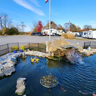 Nice clean rv park. There is a little pond - I don't know if fishing is allowed, but I didn't see any signs saying you can't. They have activities for the kids.It looks like a nice place to stay.Location is off US-I-75 at Cherry Bloosom exit in Georgetown KY. You need to go down a skinny road for about 1/2 mile, but it's straight and easy. The front entrance and driveways are good and wide.