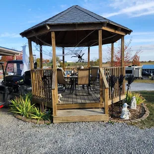 Very well run RV park with clean sites, plenty of amenities, friendly helpful staff, and entertainment.The sites are mostly level and well done with gravel and nice green grass. It's always less stressful to have nice wide lanes to be able to maneuver our long travel trailer into our site without bothering anyone like they do here too. The location is enough out of the way to make it quiet and beautiful, but close enough to make it easy to get to from the freeway.