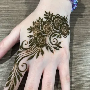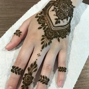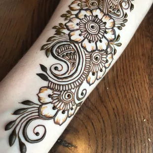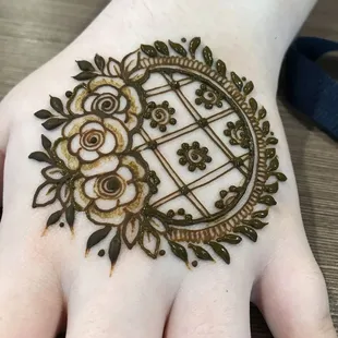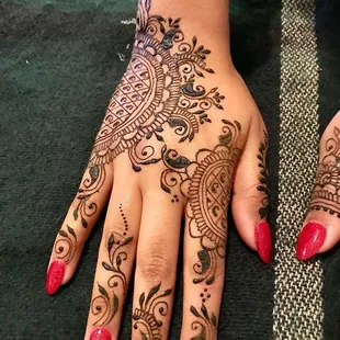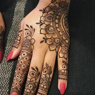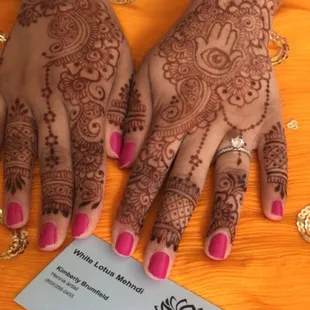 Kim is probably the best Hannah artist and I Louisville Kentucky I have been here for about 20+ years and have not found anyone that does Henna as good as her. I don't even have to give her an idea or a picture or a sketch, her ideas are so creative and she makes the henna look so well on top of that she uses organic products that do not harm my sensitive skin and her henna also leaves the stain on for weeks I am so impressed with her she is booked for my wedding for me for my bridesmaids and she also did my engagement henna which you can see above under the orange layover. I'm impressed by her each and every time and I would and DO recommend Kim to anyone in the state of Kentucky. She is such a sweetheart and does her work with passion and creativity that she has for Henna. You get a great outcome and more for what you pay for:)