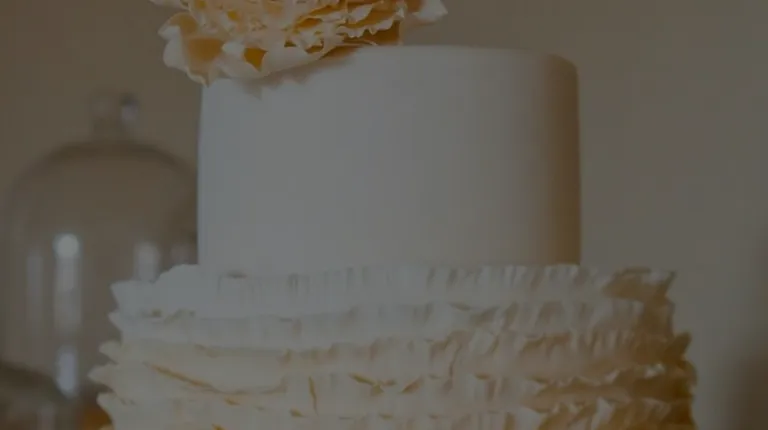 a three tiered cake with ruffles and a flower on top