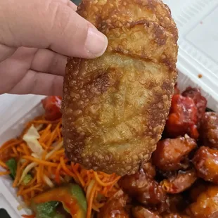 1 item Lunch combo. Sweet and sour pork and 1/2 noodles and rice. Sauce on the side. Pork is crispy.