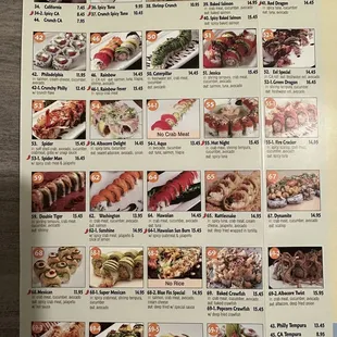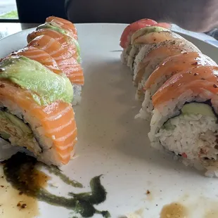 Two Rainbow rolls, Washington roll (salmon) and Eel roll.