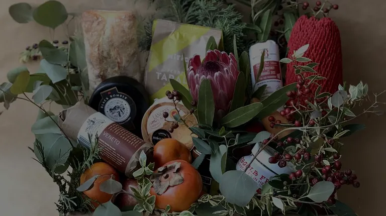 Medium Gift Crate with Cheese, Salami, Nuts, Fresh Fruits, Dried Fruits, Bub & Grandma's Bread, Crackers, Jam and Flowers