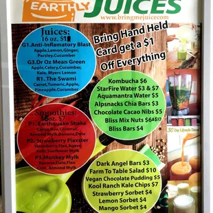 This is possibly my favorite juice place to have ever existed! The employees/owners are so loving and passionate about what they do. Jen and Brennan are always welcoming with smiles. My favorite smoothie is the Earthquake shake. I add mint to mine for a cool burst. If you order a cleanse to-go, you get your drinks in mason jars. Earth conscious, friendly, healing, refreshing. That's Earthly juices. The best part, it's all organic!!! And affordable! Approx $7 16oz. Sign up for the rewards program and get 2$ offBe careful parking, the store is difficult to locate and the parking lot is small and a little awkward.
