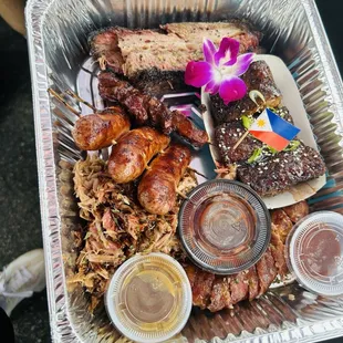 Pork belly, adobo longanisa and ribs.