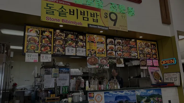 Hank Kook Kwan is located in the Korean Plaza in Korean town in Orange County, CA serving up korean stone bowl food and much more.After browsing through the Korean Plaza we make our way to the food court and notice all the pictures and advertisements of the food and decided to give it a try. We went ahead and ordered the beef bulgogi bibimbap, and seafood Korean pancake. The prices are quite steep here and especially for a food court setting so be prepared to cough up some money. After visualizing the cook through the restaurant I watch her make my meal. I notice she is running around the kitchen grabbing items from the fridge and putting them back in with no cover while cutting things. In my head I think wow so unsanitary coming from a food service background. I go ahead and take my seat and in about 10 minutes the food was ready. The cashier just calls out the food order and I pick it up. The bibimbap was sizzling than ever in the black stone bowl. It had a fried egg, radishes, beansprouts, spinach, mushrooms, and some pickled veggies below and a small amount of beef and a bed of white rice. I go ahead and mix it all up and incorparate all the ingredients together while letting it cook more. Quick time first bit and the taste was bland and not exciting. When i think about why its because it was just rice with some veggies and a small amount of meat. There was a bottle of gochujang sauce he provided as well but i didnt even want to touch that bottle because on the tip it had gunk from the previous uses and that right there just killed my vibe. After seeing that bottle it completley ruined my appetite and I wasnt hungry anymore just with all the thoughts going through my head. Everyone knows in the food service world to clean the bottle and top caps after each use with a hot watery rag! The seafood pancake wasnt special anyways and wasnt even crispy on the bottom. There was no color to it and char but just a bunch of squid and shrimp with no veggies.Meh, I expierenced better Korean food than this place with high prices and mediocre but not extravagant food I think ill find another place. If maybe they just tighten up there sanitaton and clean as they go and put a bit more love in there food I might be back.