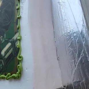 She made this cake the wrong colors, I asked for red and white. It's Spider-Man instead. And she made the sticker I didn't ask for lopsided... it looked rush and messy...