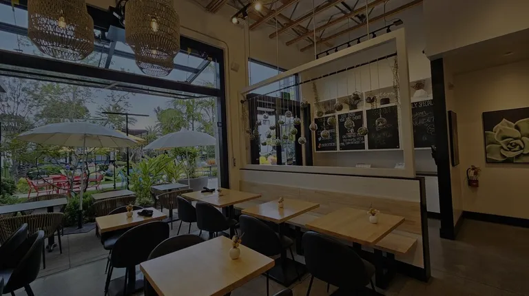 a dining area with tables and chairs