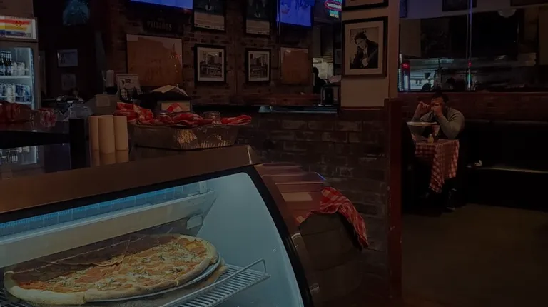 great by the slice brooklyn style new york pizza. reasonably priced 5.99 gets you a hefty slice that will fill you up on its own. pizza is good enough youll want another slice. reasonably quick service. no annoying gimmicky tech gimmecks. order at the counter, over the phone or online. everything is good.ambience is authentic hole in the wall pizzeria. banquettes, and hard chairs. post covid has a patio. lol