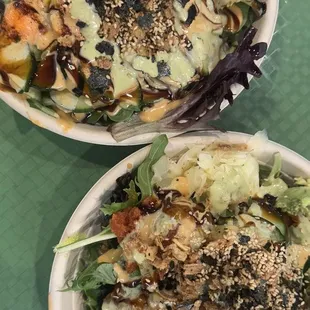 2 small bowls the front is with a scoop of avocado crab meat. It is half salad and white rice with lots of selected toppings.