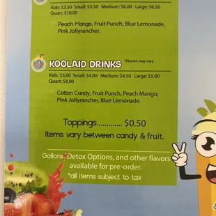 We walked in and we were created by the owner. The store has plenty of activities to keep children and adults like entertained. My daughtereven made friends while we waited! We ordered smoothies the tropical smoothie was sooo yummy. My toddler got the nana smoothie and all she could say in the ride home was Mom try some of mine...it's soo good! GREAT DRINKS GREAT ATMOSPHERE GREAT OWNER!