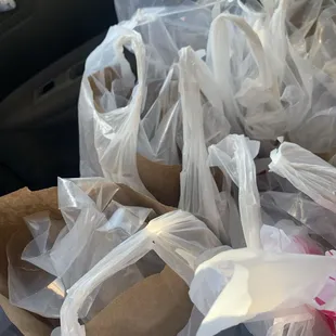 a restaurant counter with bags of food