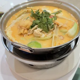 Absolutely loved their hot pot experience!I totally did not understand how they were and were not connected to bowl Thai grill and sweet rice so that was my bad. I will make sure to bring the rest of my family to eat here next time because of boy was that hot pot HUGE!!I put some napa cabbage, mushrooms, the firm type of tofu, lobster fish balls, baby octopus, scallops,bshell on prawn, and glass noodle in the tom khaThe broth is so flavorful and everything was so fresh. I also loved dipping the veg and seafood into their sauces to get different flavor combos. The owners and staff where so nice and helpful since I've never been there before and were even willing to accommodate us when we ordered from bowl Thai grill by mistake. There was quite a few tables but I could see them getting really busy soon so just be aware of that.