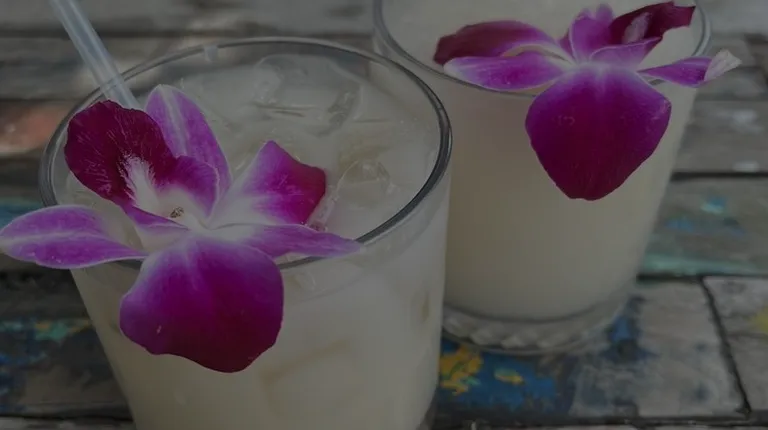 a glass of lemonade with a purple flower