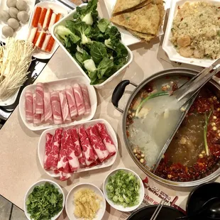 I visited on a Thursday night and it was completely dead- I was the only patron. We ordered a ton of food for the table, which was good. However, because we were the only table, the waiters were a little *too* attentive. Every time we finished with a dish, within 30 seconds they had come by and cleared the table. We could see them standing at the edge of the room watching our every move, which was a bit nerve-wracking. They did not have a sauce bar, which is pretty uncommon for hot pot restaurants. They also served the meat in cheap, plastic take away containers. Not very aesthetically pleasing at all. And then the bill came- it was $90 not including tip, and it was not AYCE- it was al a carte. The price was outrageous as I had paid less for KBBQ AYCE a couple nights before.