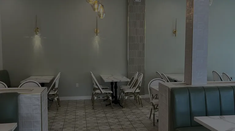 a corner of a restaurant with tables and chairs