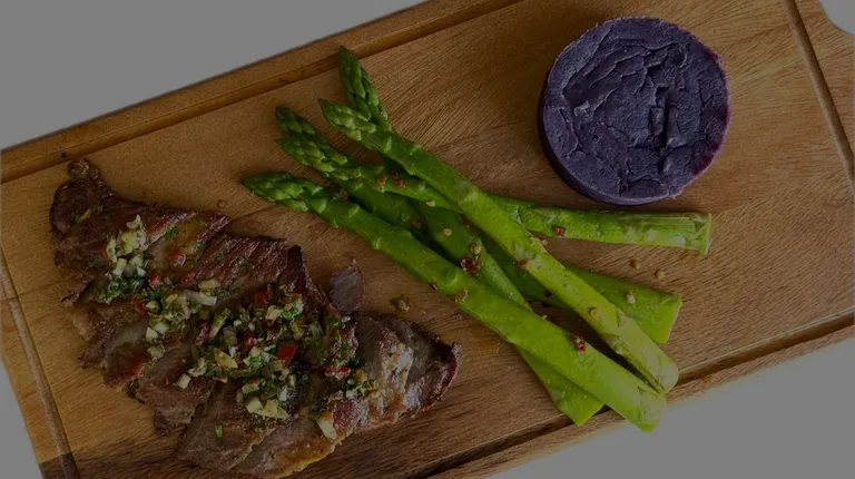 Heirloom Iberico - 10 oz "EL SECRETO" pork skirt steak served with asparagus, purple mashed sweet potatoes & chimichurri