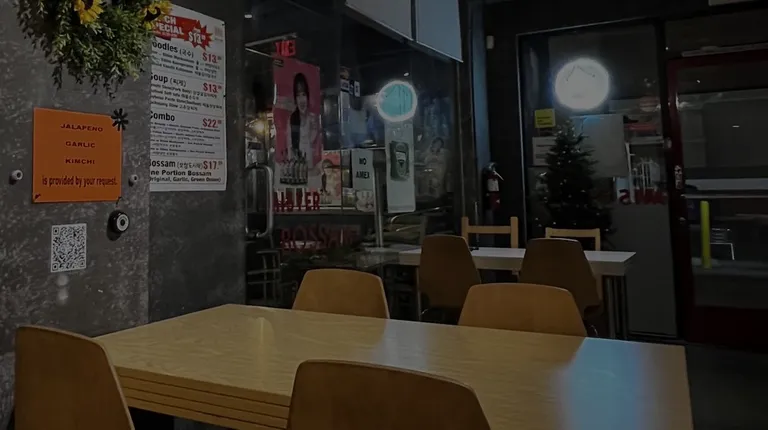 Yummy quick stop for bossam! Stopped by on a Wednesday night and there was only 1-2 other parties that came in, so service was quick! The green onion bossam was better than the garlic bossam in my opinion, rice was free addition, and food came out quick! Bossam arrived on top of a heating dish with a flame, which was surprising. It slightly smelled like smoke inside the restaurant, which was unrelated to the flame of the heating tray, so that was odd but otherwise the atmosphere was nice! Free parking too!