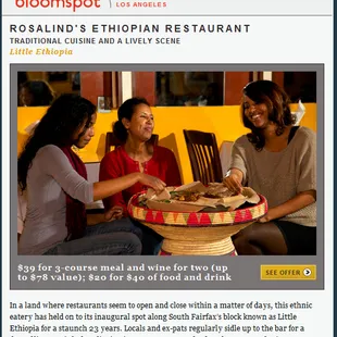 Weekend lunch here with a friend. Saturday afternoon. Arrived around noon. Not very busy at all. Just a few parties inside. No one sitting outdoors. I started off mentioning this because I have to say, service was a little lacking. Not very attentive but may have been preoccupied in with BOH duties because there were a times when I looked around and didn't see anyone. Food was served quick. Faster than any other Ethiopian restaurant I've been to. That was great because my friend and I were starving. We shared the Emperor, see pics. We both felt the same about the dish - we felt that the flavors seemed a bit muted. Not void of flavor, but maybe not as much spice that we both tend to favor. To clarify, it wasn't bad - just not quite hitting the spot, so to speak.Rosalind's is located in Little Ethiopia on Fairfax. So you know how parking can be. I found a meter a few shops away but I also know that if you don't mind walking, there are non-metered spots down towards the residential areas. Just mind the signs as permits or restrictions might apply. I love Ethiopian food and have been to a number of spots. Not sure if this is one I'll revisit as there are others I haven't been to - but if I do, I'll definitely ask if their dishes could be prepared spicier or with more kick.