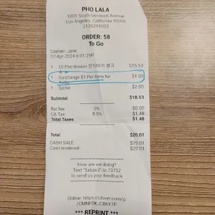 I was surprised there's a $1.00 surcharge on TO-GO orders. The charge is for the container they put your food in. I'm really tired of establishments who want to do business for free. There's a cost of doing business! Instead they choose to pass the cost to the customer. Instead of passing cost, they could ask customers if they want cilantro, basil and/or lime. If not, save on costs that way. But please stop passing on your cost of doing business to the customer.The meals at Pho LA LA can be hit or miss. The first time I had the Pho Brisket it was great, the second time it wasn't good. So depending on who's cooking that day will determine the satisfaction of your meal.