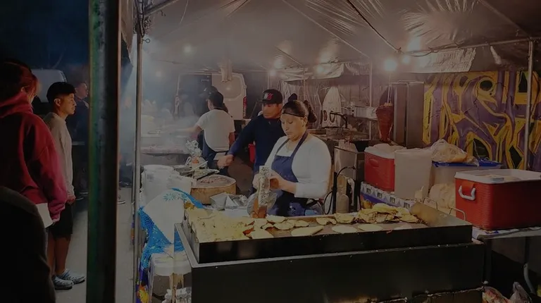 Came on a Sunday night and parking is terrible around here lol. It is street parking only and it's kind of in a shady area. Luckily I was able to find parking right in front of the stall. It seems that a lot of people just stall in front where they're blocking the lane, so they can just grab & go... It seems like they don't really care?The line did take awhile for tacos, it was moving pretty slowly. It was also very smoky as well. I got to order 2 carne asadas and 1 al pastor taco. The guy making the tacos was very quick! So i'm not sure why it took awhile for the line to move.. but probably other people are ordering a lot of items in front of us. Order came out to be like $8. After ordering, you get to the station where you can put your own items, which the cook already basically put everything in for you, so there was only really radish or grilled onions that you can add for yourself. There were a few tables that were questionably clean. After a few bites, I thought it tasted pretty good, but I wish the green (guac?) sauce had more of a chunkier texture. All the meats also highkey tasted the same, it was actually pretty spicy too. They weren't they meaty, but it tasted alright.Overall, the entire experience was just okay. I feel like they didn't have as many items as other taco joints, like quesabirrias. Also the parking, makes it not as worth it. I still rather much go to Ave 26 for convenient and delicious tacos.
