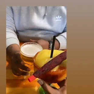 a glass of beer and a plate of churros