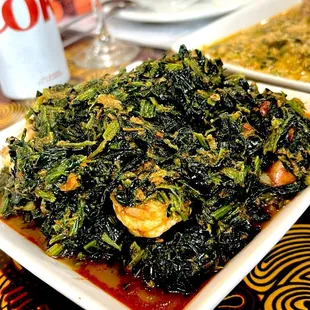 Authentic Nigerian home cooking, close to LAX. The menu is varied, including regional dishes served in family style portions. Prices may seem high, but dishes feed 3-4 people. The interior is casual and simply decorated, with a small amount of seating. They serve Nigerian beer and wine. I knew I had made a good choice when the other patrons dining at Veronica's informed me that they are Nigerian. As I waited for my takeout order, we chatted about popular Nigerian dishes and how to eat them, which I appreciated, since this was my first time trying the cuisine. To be honest, I had ordered without knowing what I was getting lol. I was happy to have made some friends to talk with, since I waited 45 minutes for my takeout order, despite the restaurant not being busy. I ended up with Edikaikong, a spicy and healthy Nigerian classic with flavorful greens and big hunks of preserved fish. I loved the greens, which I enjoyed with the firm, creamy mashed potato-esque fufu. The fish was way too salty for me; I will ask for an entirely vegetarian dish next time. I also enjoyed the Nigerian beer, which reminded me of Coors Banquet.