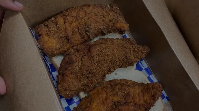 Jumbo Chicken tenders with a side of toast, slaw, and Ziggy sauce comes with fries.