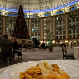 A good dinner with a great view! We were visiting the area for the first time and knew we wanted to stop here so we could enjoy the atrium while we ate. We dined in fairly early and sat ourselves. The staff were there right away bringing water, snack mix, and menus. All the staff were friendly and super prompt.I had the chicken salad sandwich with fruit and it was delicious. My brother had the signature burger. He ordered it medium, it came out well done but he still enjoyed it. It is a little pricey but I really think you're paying for the atmosphere, not necessarily the quality of the food. Overall, it was a great dinner!