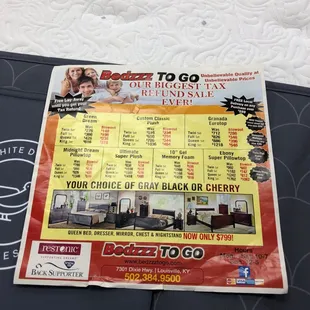 I can't say enough about the folks at Bedzzz to Go! After the retailer of our previous mattress failed to honor their own warranty, we had the fortune of meeting Dennis M. of Bedzzz to Go. He worked on our behalf and got the manufacturer to honor their warranty through him, even though we had purchased it through a competitor! Bedzzz to Go has incredible customer service, a great selection, and the best prices. We got a brand new, king size, memory foam mattress set for less money than we had spent on our spring loaded queen set years ago. We had never before shopped at Bedzzz to Go. Now we never plan to go anywhere else again. You shouldn't either. If you want to sleep easily, both literally and figuratively, go visit them on Dixie Highway. You won't regret it!