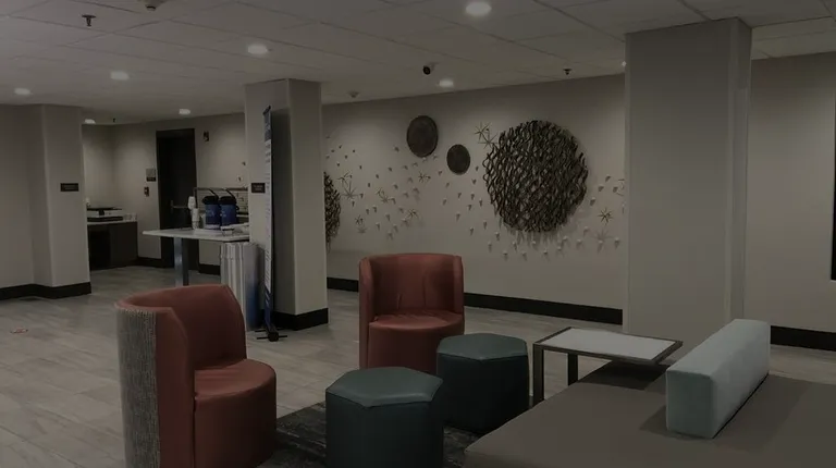 We didn't check in until 1 am but the hotel was in an area with a bunch of other hotels and near restaurants and shops. It was clean and our room has everything we needed. The bathroom was tiny though.I tried to call the front desk at 2 am to ask a question and it took forever for someone to answer.The lobby is nice and there's a fitness center. The pool was closed "for maintenance" but I'd love to see if it ever opens.The breakfast attendant was RK and he was extremely nice. I'd give him 5 stars! We showed up ten minutes before breakfast ended and he didn't try to rush us. They had eggs, sausage, biscuits with gravy, yogurt, cereal, bagels and a cool machine that makes pancakes.