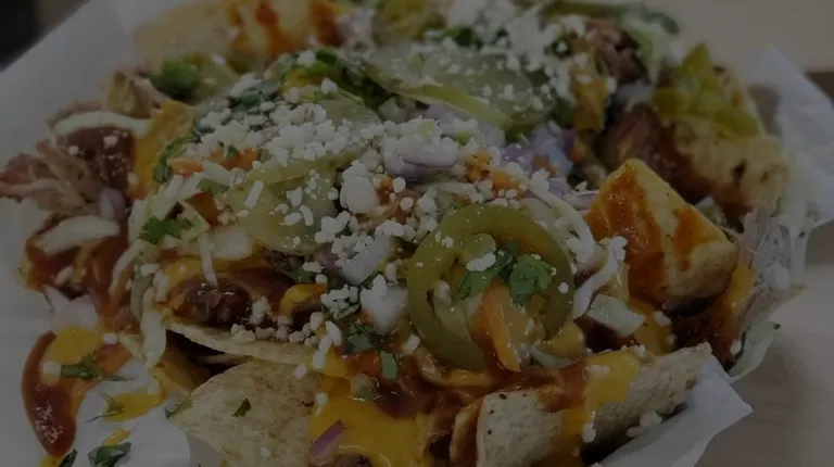 Was able to try this at the last flea off market. The pork nachos are amazing!! Tops with cheese, jalapeños, onions, pulled pork, and pickles! Yes pickles! It isn't super fast and the line goesSlow, but the nachos are so worth the wait! Go with super spicy sauce the spicy isn't so spicy. Also, grab a fork you will need it!!