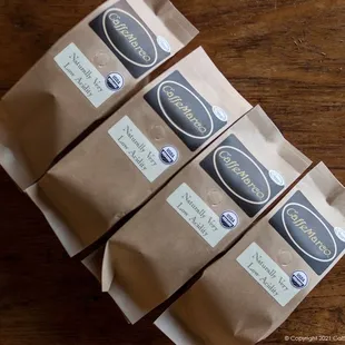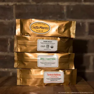a stack of coffee bags on a table